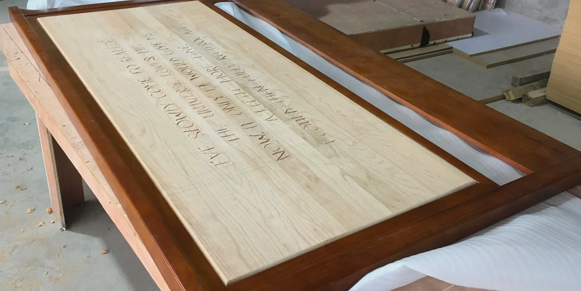 In nearly 30 years of practice, Gary Hill has used images as a medium of expression. In recent years, the artist has been increasingly trying to return to "being physically associated with objects". When creating the Untitled Bed, Gary Hill used wood engraving, carving out the ambiguous sentences on 10 wooden headboards of 1.9mx1.3m (1.8mx0.8m inner frame) – all written in English by the artist.