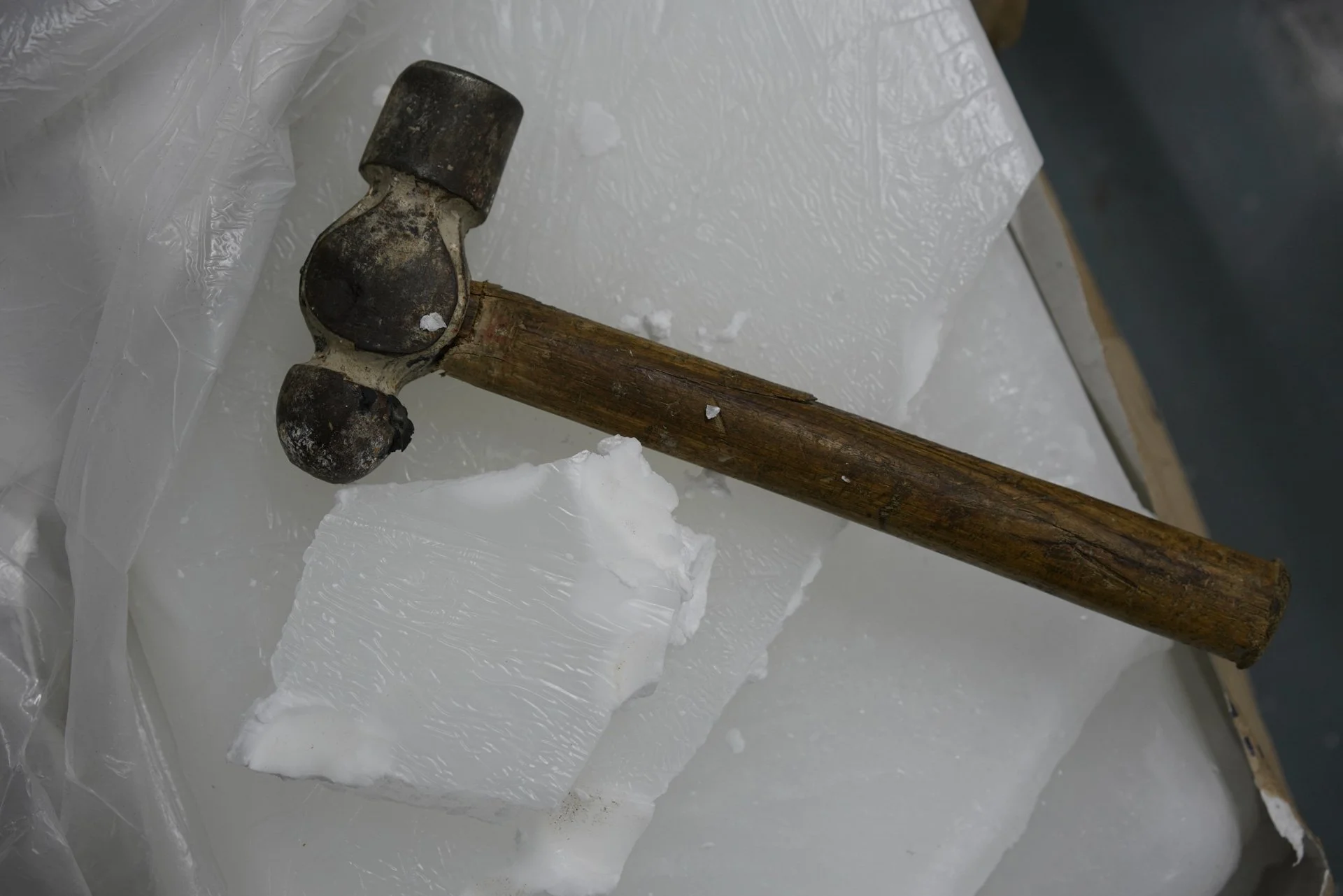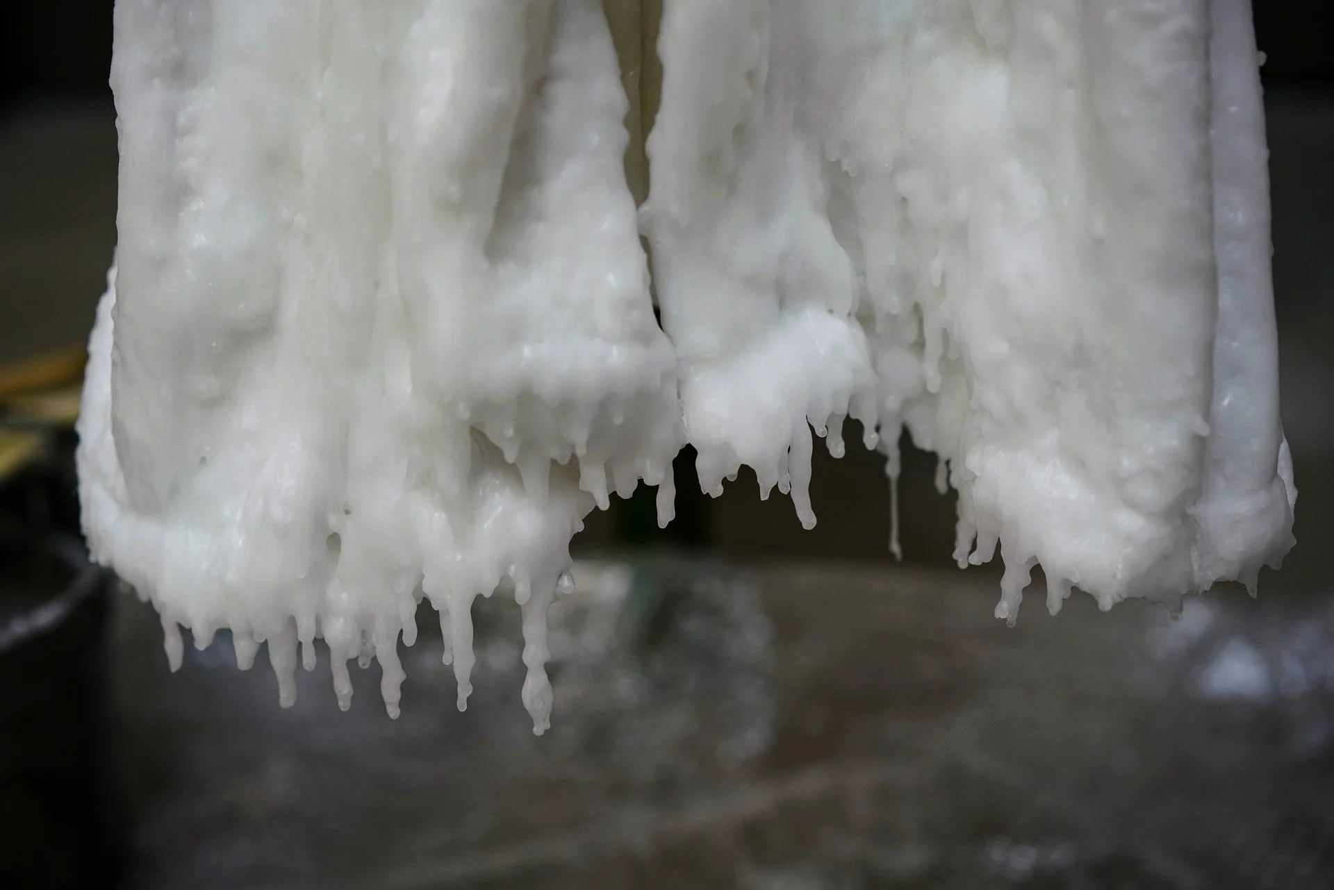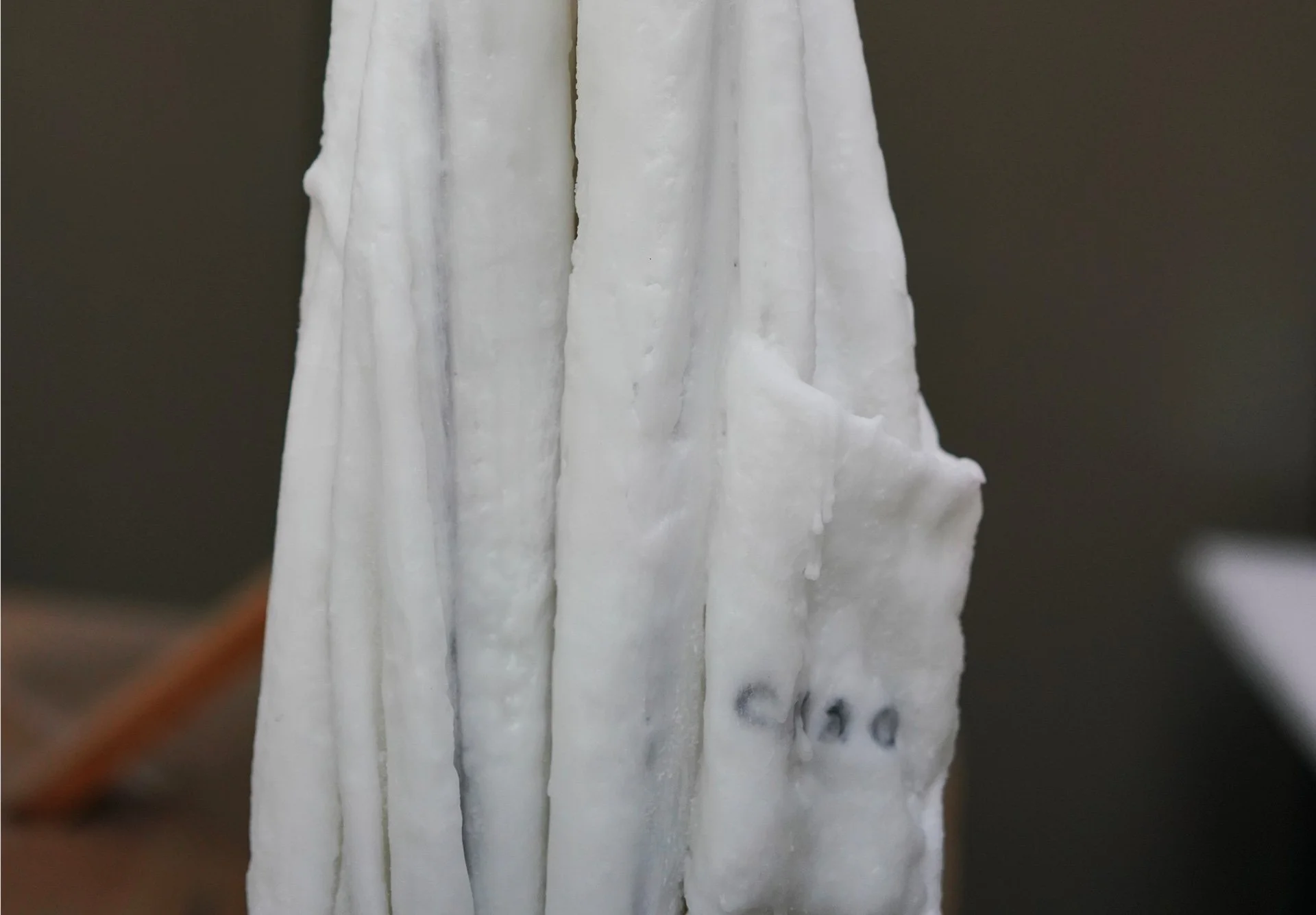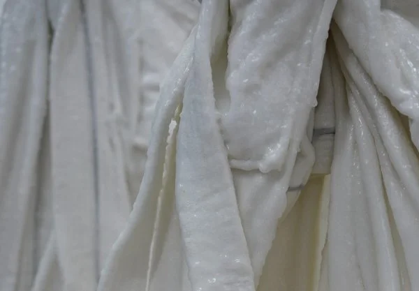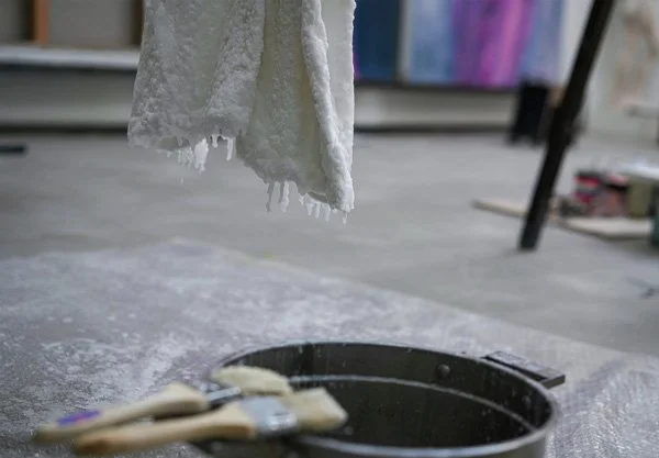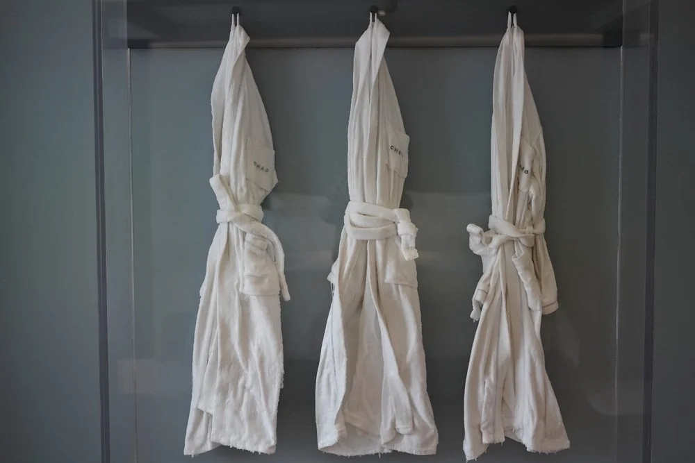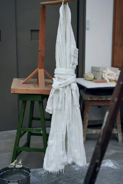 Jiang Jie immersed three bathrobes in paraffin. In this way, she could build a connection between two completely different white materials, and create simple but rich interpretation in the limited space of the guest room. Jiang fixed the softness of fabric and the transience of time with paraffin.